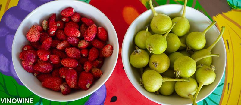 No puedo reprimir mis ganas de mostraros las frutillas del postre. Y es que en el mercado es una delicia dejarte llevar, estar abierto a probar aquello que te encuentres. Es el caso de estas fresas y las peritas de San Juan. Estas peras son raras de ver porque quedan pocos árboles de su variedad. Bocadito terso y dulce moderado. He preparado las las fresas macerándolas con un vino tinto dulce de garnacha del Vall de Xaló (Alicante).