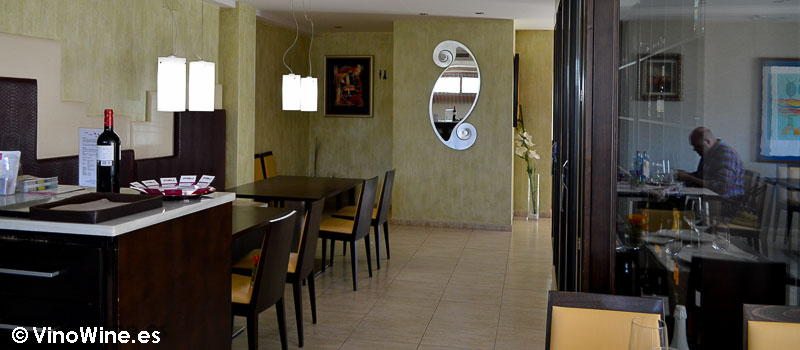 El restaurante es agradable, sin duda. Al acceder uno se encuentra con un pequeño espacio que hace las funciones de recepción y unos escalones que nos llevan, tras dejar a un lado la bodega acristalada, al salón principal. Al estar ubicado en un edificio que hace esquina hay amplios ventanales que permiten la entrada de luz, cosa que dota de gran calidez al comedor. Mesas en tonalidades wengué vestidas con elegantes “caminos” de mesas, colores claros en las paredes, lámparas modernas… Funcional a la par que elegante.