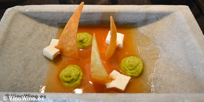 Sopa azteca: Plato inspirado en una típica sopa mejicana a base de tomate, chile, aguacate, totopos de maíz y queso fresco La Vall de Ontinyent. Versión refinada y elegante del popular plato mejicano del que destacaría el caldito como vehículo conductor del plato, con un sabor predominante a tomate.